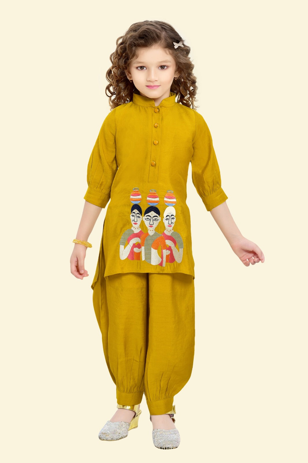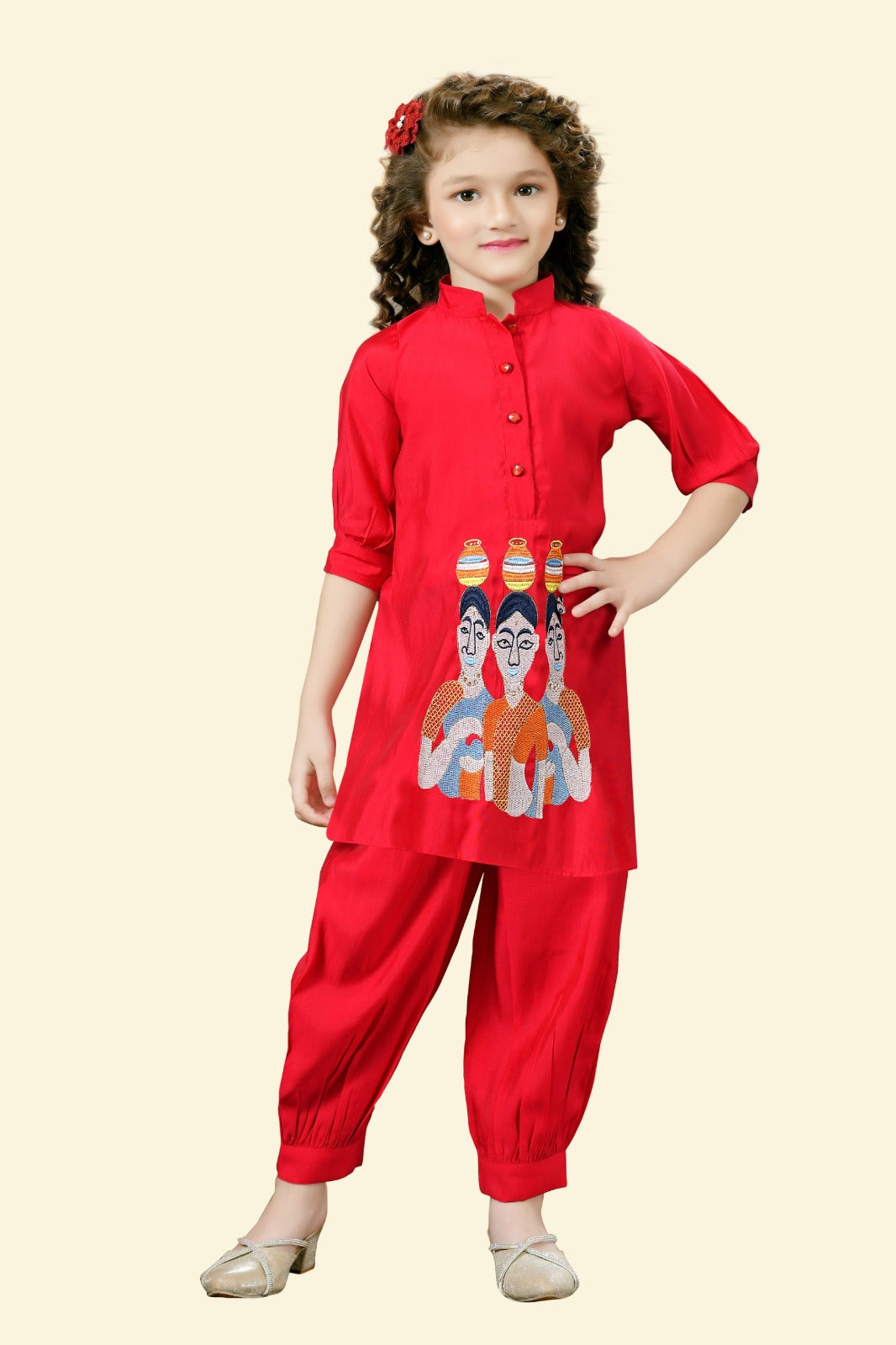 This vibrant ethnic set brings together artistic expression and everyday comfort. The front embroidery, inspired by traditional folk art, adds a bold, cultural statement to the collared kurta. Paired with relaxed-fit salwar pants, this outfit ensures freedom of movement while keeping your little one stylishly festive.