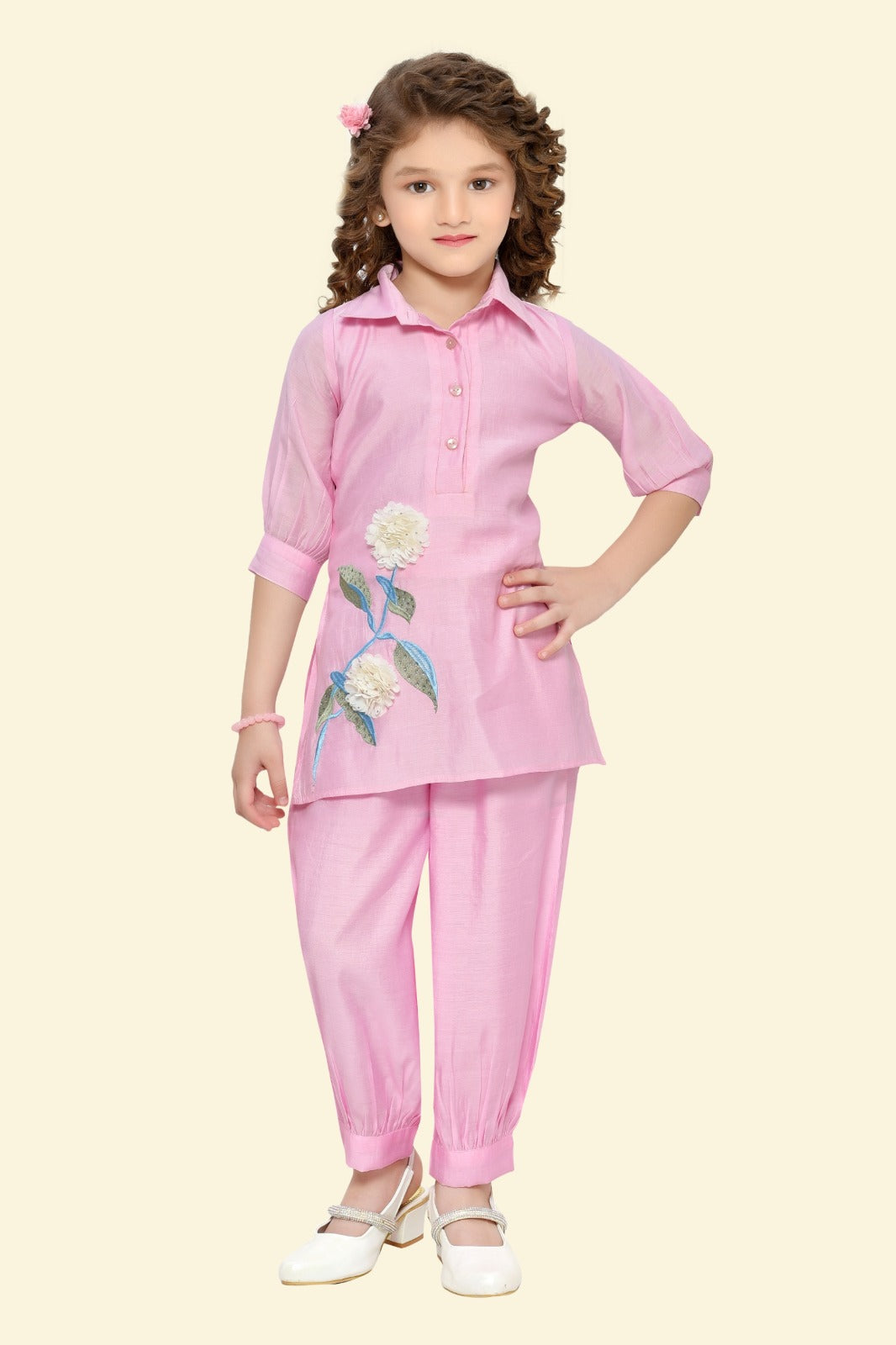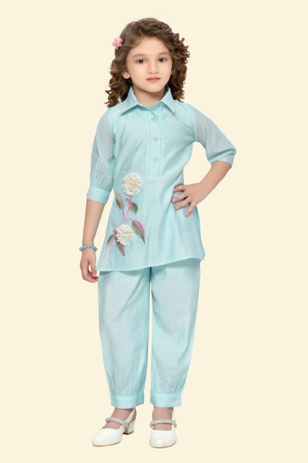 Make your little one the star of every occasion with this charming Girls' Kurta Pant Set (5–14 Years) — a perfect blend of everyday elegance and festive charm. The collared kurta features delicate floral embroidery and is paired with matching pleated pants for a graceful and comfortable look.