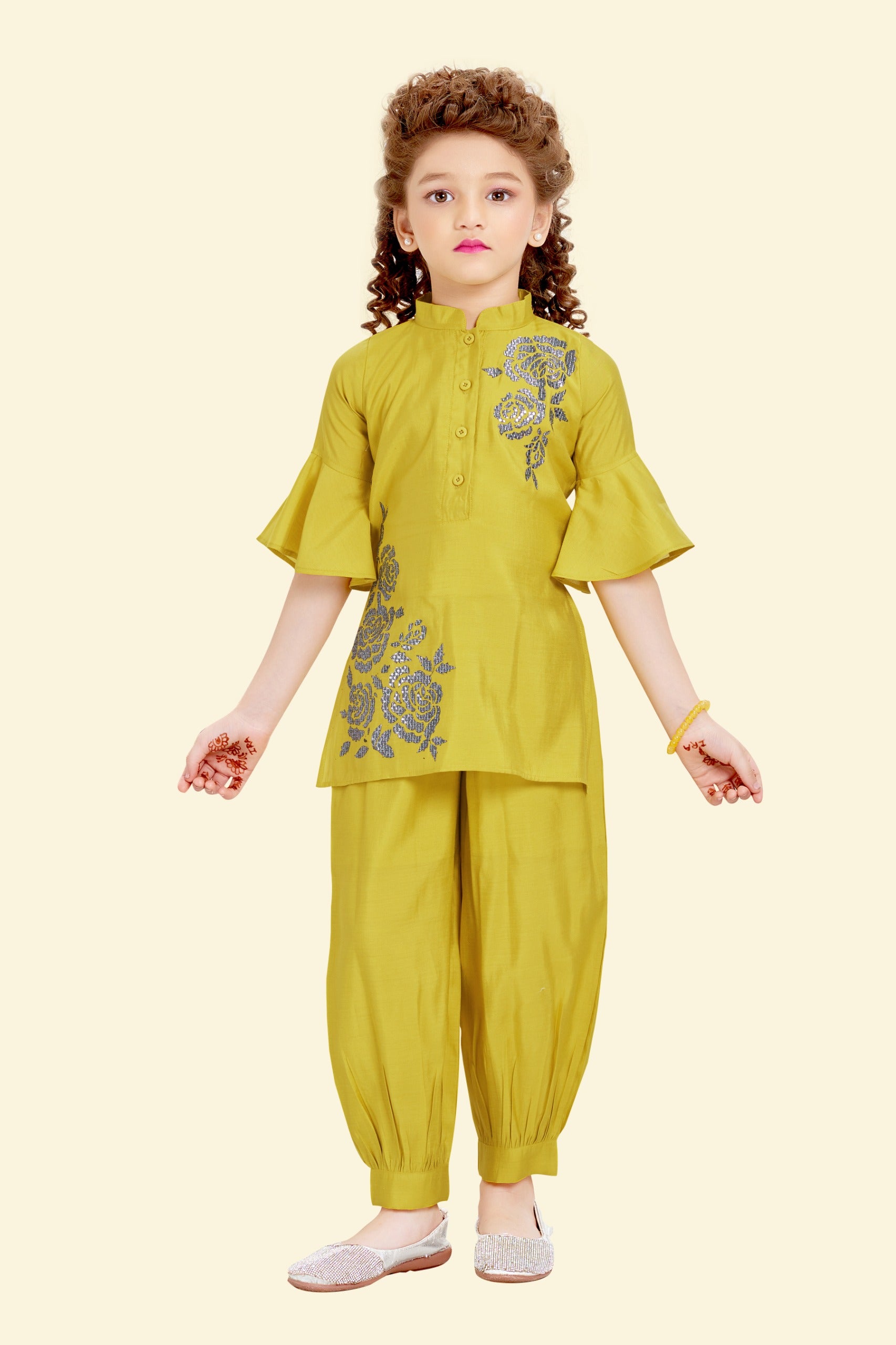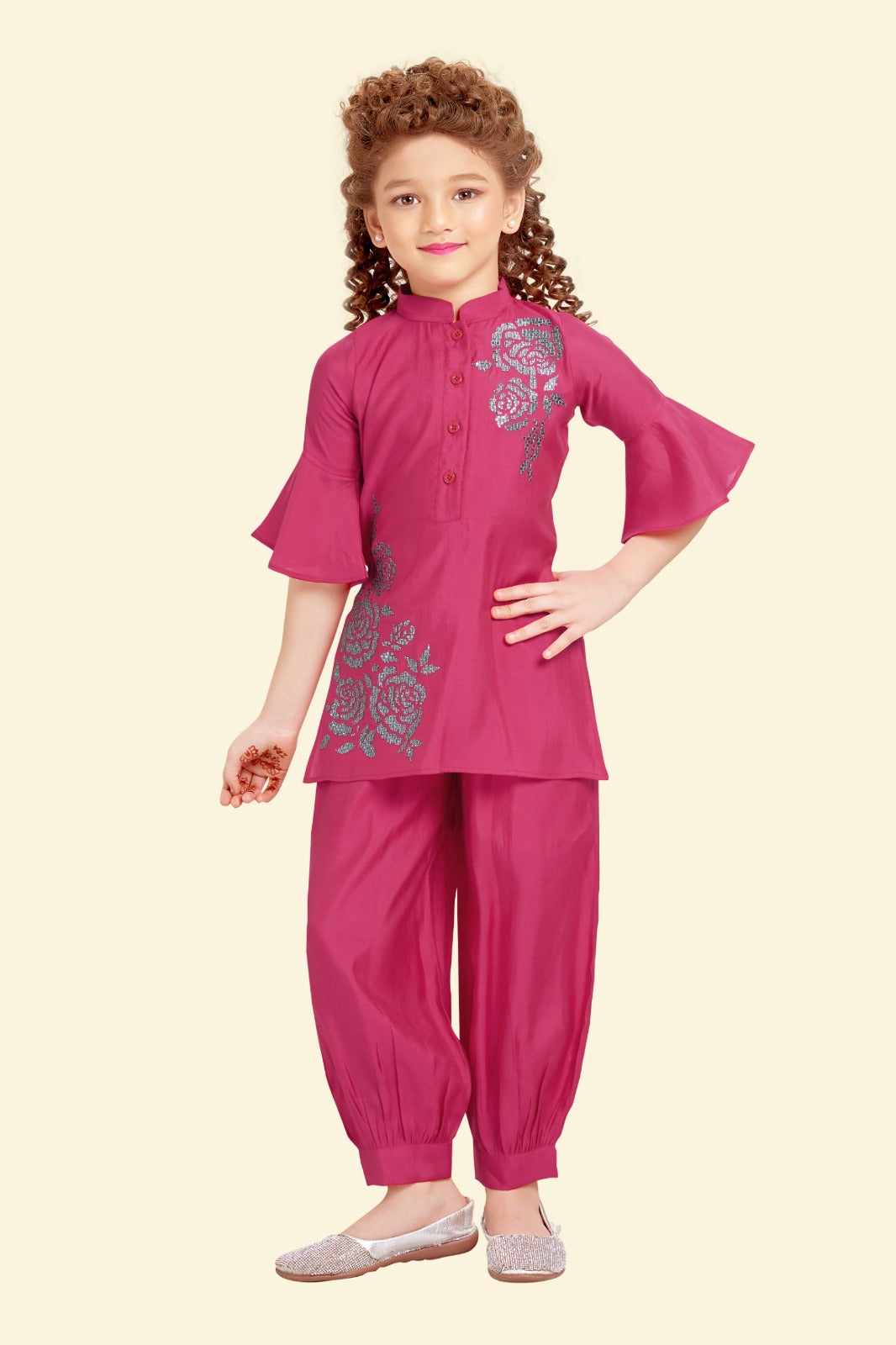 This elegant ethnic set in rich Rani pink & Mustard lemon brings a graceful twist to festive fashion. The embroidered floral motifs on the kurta add a refined shimmer, while the stylish flared sleeves and gathered tulip pants offer a playful, contemporary silhouette. It’s the perfect pick for your little one to shine at special events.