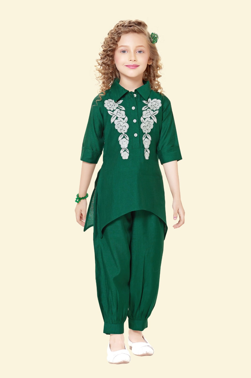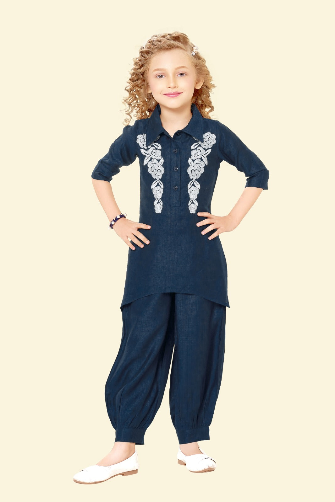 This beautiful ethnic set combines modern flair with traditional charm. The detailed floral embroidery on the collared kurta adds a refined touch, while the soft, gathered tulip-style pants ensure comfort and style in every twirl.