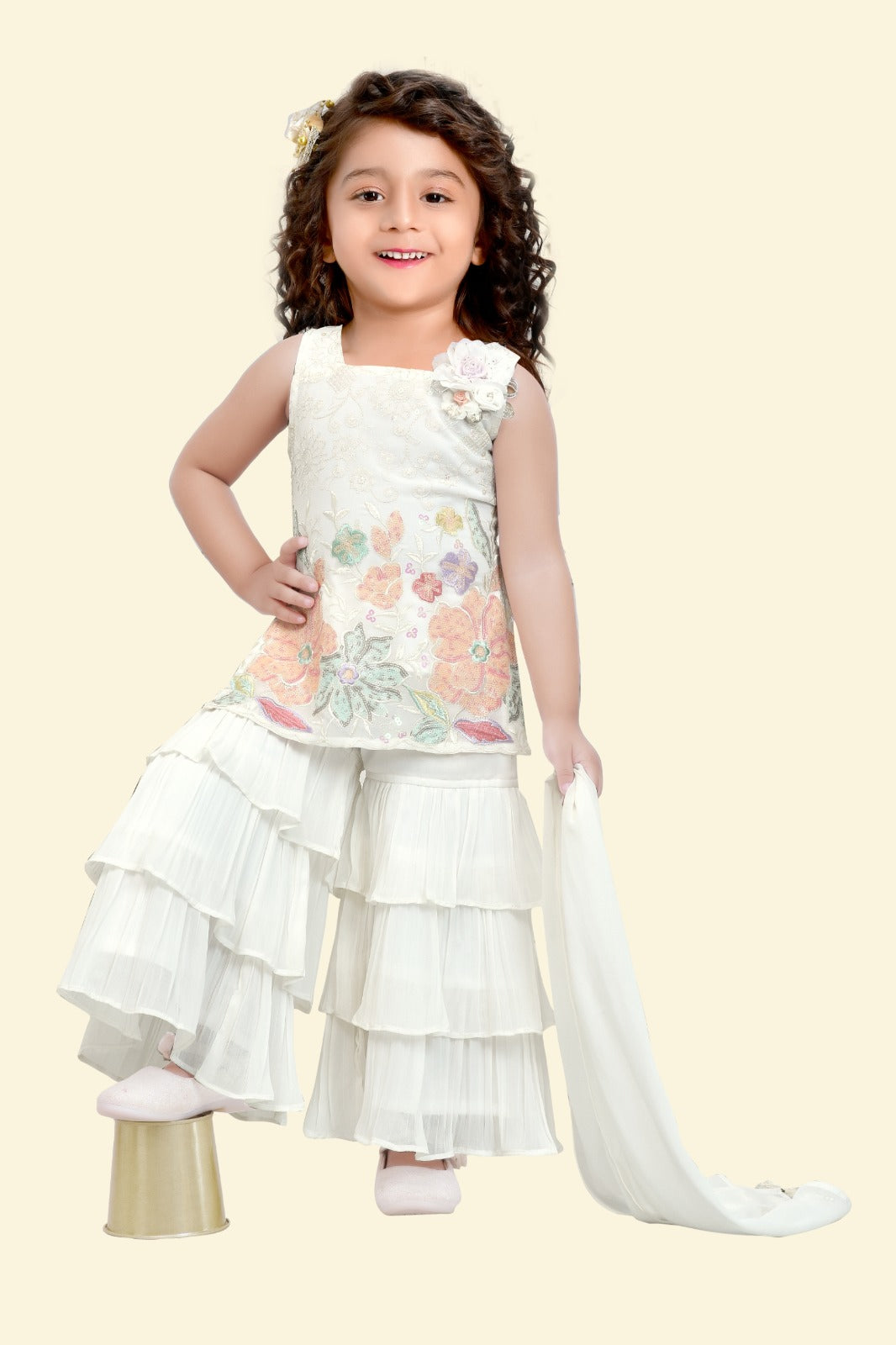 Grace meets style in our Cream Ruffle Palazzo Set for Girls (1–6 Years) — a dreamy ethnic outfit designed for your little princess. Featuring a delicately embroidered sleeveless top with a 3D floral appliqué and matching ruffled palazzo pants, this set is completed with a soft flowing dupatta for that picture-perfect festive look.