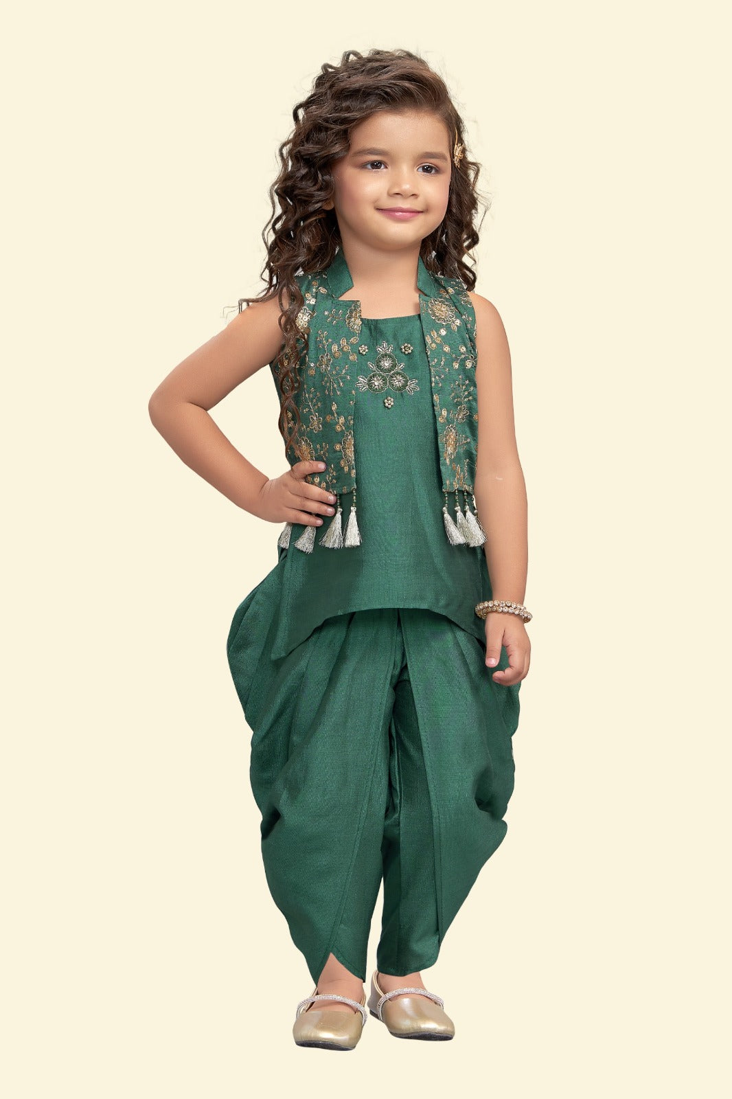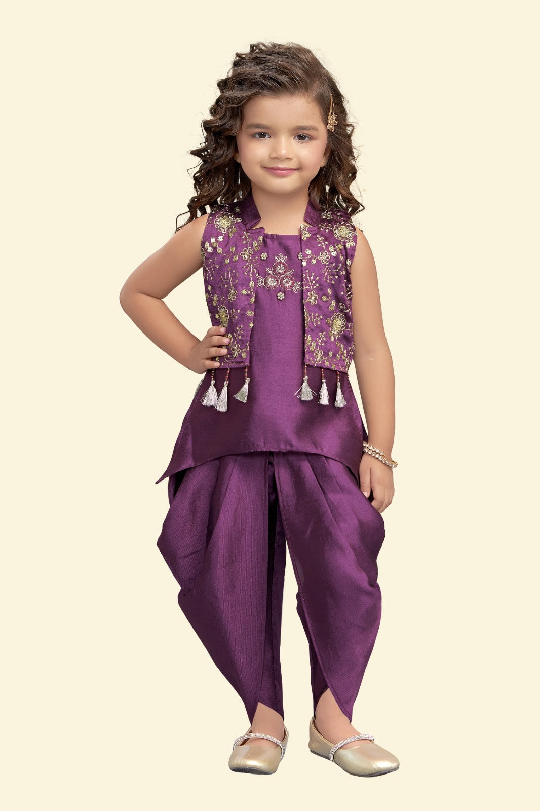 Make your little one the star of every occasion with this stunning Girls' Dhoti Kurta Set (1–6 Years) — a perfect blend of ethnic charm and festive flair. The sleeveless top is paired with stylish dhoti pants and comes with an intricately embroidered jacket finished with elegant tassels.